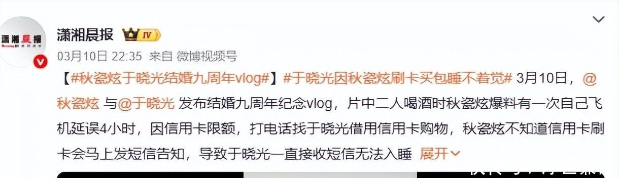 引发全网热议的,正是秋瓷炫与于晓光。2026年3月10日零点整,二人同步释出结婚九周年纪念短片。镜头里没有奢华布景,没有明星阵仗,只有四合院内摇曳的烛火、泛黄相册里定格的旧时光,以及两人并肩而坐时指尖不经意相触的温柔。可就在这样静谧的氛围中,一个关于信用卡消费提醒的小插曲,意外引爆话题#于晓光因秋瓷炫刷卡买包彻夜未眠#,强势冲上微博实时热搜榜TOP3。